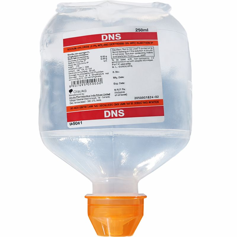 DNS Saline, also known as Dextrose Normal Saline, is a sterile intravenous (IV) infusion solution that combines Dextrose and Sodium Chloride. It is widely used in hospitals and clinical settings to provide fluid replacement, electrolyte balance, and caloric energy to patients who are unable to take fluids orally.