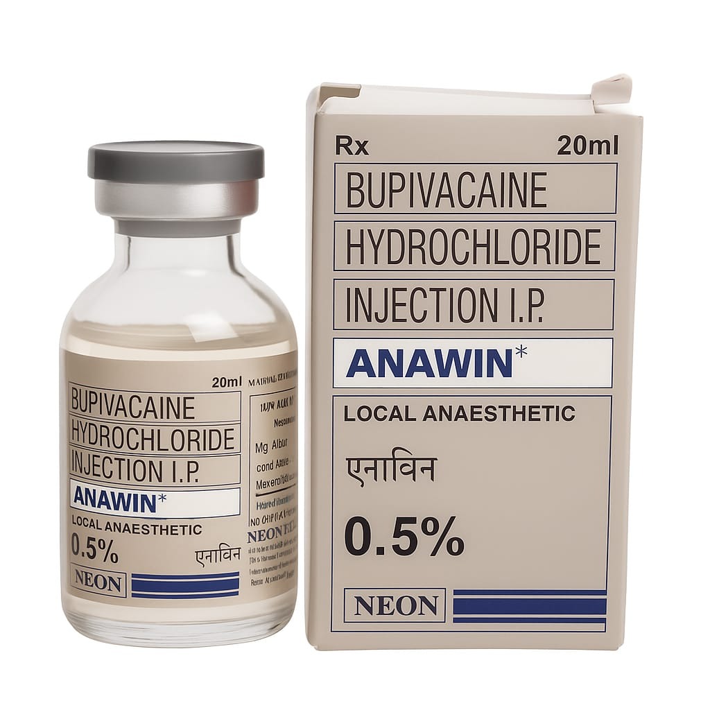 Anawin 0.5% Injection is a certified local anesthetic medicine used to produce numbness and pain relief during surgical, dental, diagnostic, or therapeutic procedures. It contains Bupivacaine Hydrochloride 5mg, a long-acting amide-type local anesthetic that works by blocking nerve impulses responsible for pain sensation.