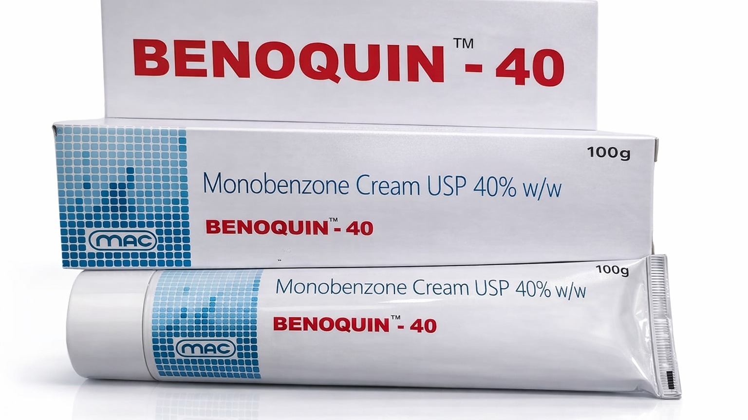 BENOQUIN 40 Cream is a topical depigmenting formulation containing Monobenzone 40% w/w, primarily used for permanent depigmentation of remaining normal skin in patients with extensive vitiligo (leukoderma). It works by reducing melanin production in the skin, helping achieve a more uniform skin tone where repigmentation therapies are no longer effective.