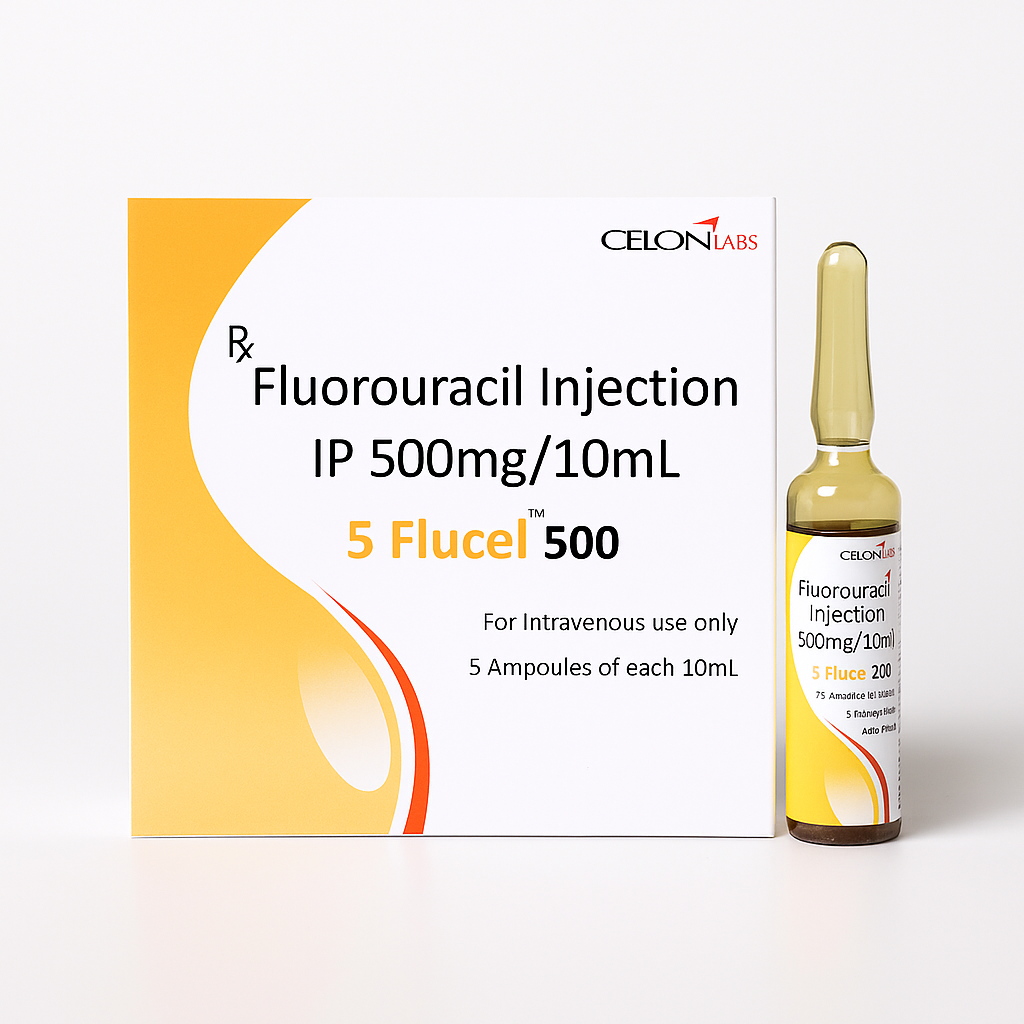 5 Flucel 500mg Injection Salt Composition - FLUOROURACIL Manufacturer - CELON LABORATORIES LTD India @ERNESTPHARMACEUTICALPVTLTD For bulk quotations, availability, and orders, please contact us: πŸ“§ Email: exports@ernestpharmaceuticals.com 🌐 www.ernestpharmaceuticals.com| www.ernestimpex.com Amit Rai: WhatsApp link https://wa.me/message/M6GESWXSIOZMD1 πŸ“² WhatsApp: +91 94054 76170 Introduction to 5 Flucel 500mg Injection 5 Flucel 500mg Injection contains the active ingredient as Fluorouracil. It belongs to a class of drugs called antimetabolites, which interfere with the genetic material (DNA and RNA) synthesis of rapidly dividing cancer cells, leading to their death. It is commonly used to treat breast, colorectal, stomach, esophagus, and pancreatic cancers. It can be administered in different ways, including through injection or as a cream. Like all other anticancer medication, 5 Flucel 500mg Injection can cause side effects. Common side effects are nausea, vomiting, diarrhea, mouth sores, hair loss, and an increased risk of infection. However, not all patients will experience these side effects, and the severity of the side effects can vary from person to person. No specific foods need to be avoided when receiving 5 Flucel 500mg Injection, but alcohol, spicy or acidic foods, citrus fruits and juices, and high-fiber foods may worsen some side effects, such as nausea, vomiting, mouth sores, and gastrointestinal problems. Patients should consider avoiding or limiting these foods during treatment. Inform your physician before starting this treatment if you have undergone surgery in the last 30 days or are following a controlled sodium diet. Uses of 5 Flucel 500mg Injection Colon and rectum cancer Breast cancer Gastric cancer Pancreatic cancer Head and Neck cancers Esophagus cancer Anal cancer Bladder cancer Therapeutic Effects of 5 Flucel 500mg Injection 5 Flucel 500mg Injection works by interfering with the DNA and RNA synthesis of rapidly dividing cancer cells, leading to their death. It is an antimetabolite chemotherapy drug that mimics the structure of normal DNA and RNA building blocks. Still, its incorporation into DNA and RNA leads to errors in formation and causes damage to the DNA and RNA strands.