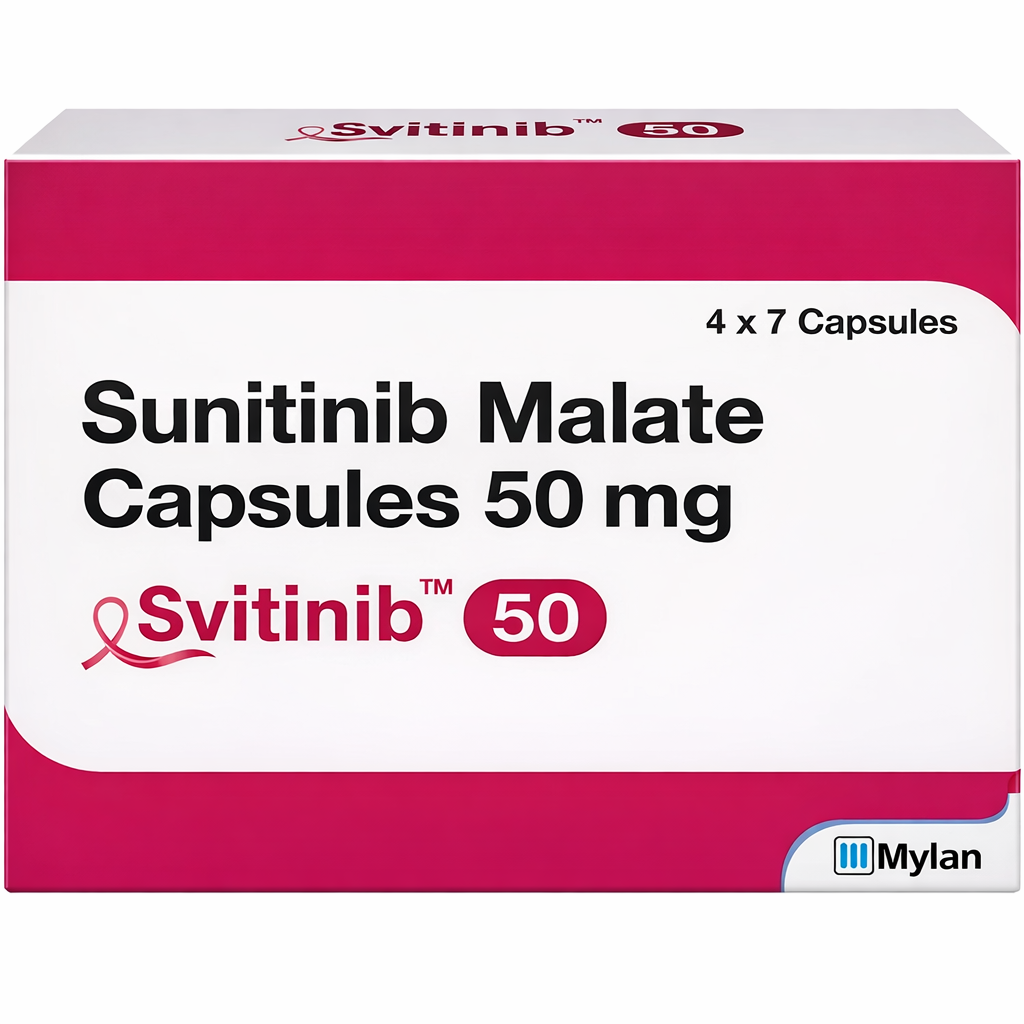 Sunitinib 50 mg capsule is an oral, multi-targeted receptor tyrosine kinase inhibitor (TKI) that has revolutionized the treatment of several solid tumors. It is the active pharmaceutical ingredient (API) found in world-renowned brands such as Sutent, as well as high-quality Indian generics like Sutib, Sutinat, and Nitnib.