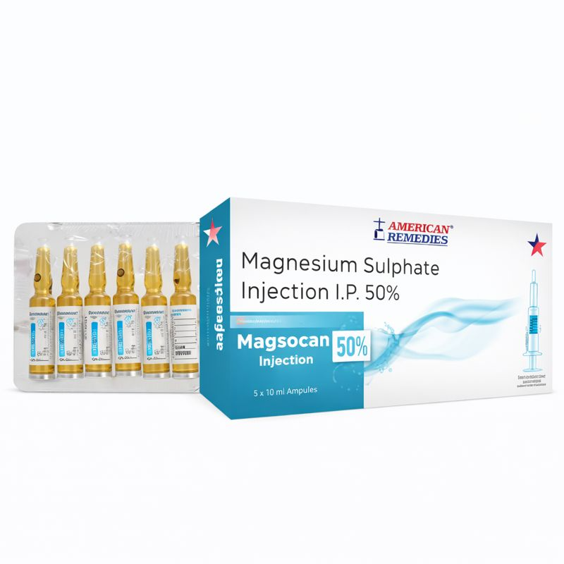 Magsocan 50% Injection contains Magnesium Sulphate 50% w/v, a clinically essential electrolyte and anticonvulsant medication used in emergency, obstetric, and critical-care settings. It is primarily indicated for the prevention and control of seizures in severe pre-eclampsia and eclampsia, as well as for the treatment of hypomagnesemia (low magnesium levels).
