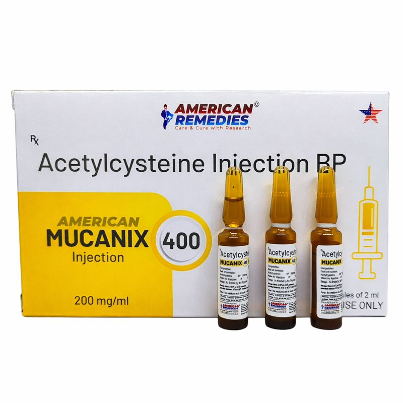 Mucanix 400 mg/ml Injection contains Acetylcysteine, a potent mucolytic and hepatoprotective antidote used in emergency medicine and respiratory care. This higher-strength formulation is designed for intravenous administration under strict medical supervision and is widely used in paracetamol (acetaminophen) overdose management as well as in conditions involving thick, tenacious respiratory secretions.