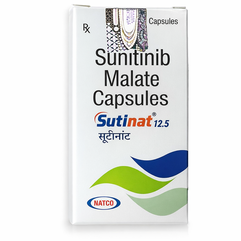 Sutinat 12.5 mg Capsule is a low-dose oral formulation of Sunitinib, a potent multi-targeted tyrosine kinase inhibitor (TKI). Manufactured by Natco Pharma Ltd., a world-renowned leader in oncology generics, the 12.5 mg strength is essential for precise dose titration and maintaining therapeutic efficacy while managing patient-specific tolerability.