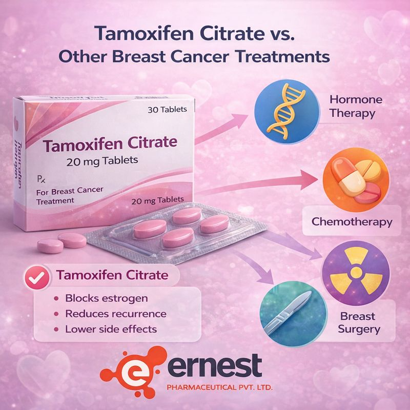 Behind every trusted medicine stands a reliable manufacturer. Ernest Pharmaceutical Pvt. Ltd. is proud to be one of the leading manufacturers and exporters of Tamoxifen Citrate 10mg in India. Our commitment to quality, safety, and effectiveness ensures that every tablet meets international standards. With a state-of-the-art facility, strict quality control measures, and a team of skilled professionals, we aim to deliver pharmaceutical products that truly make a difference.