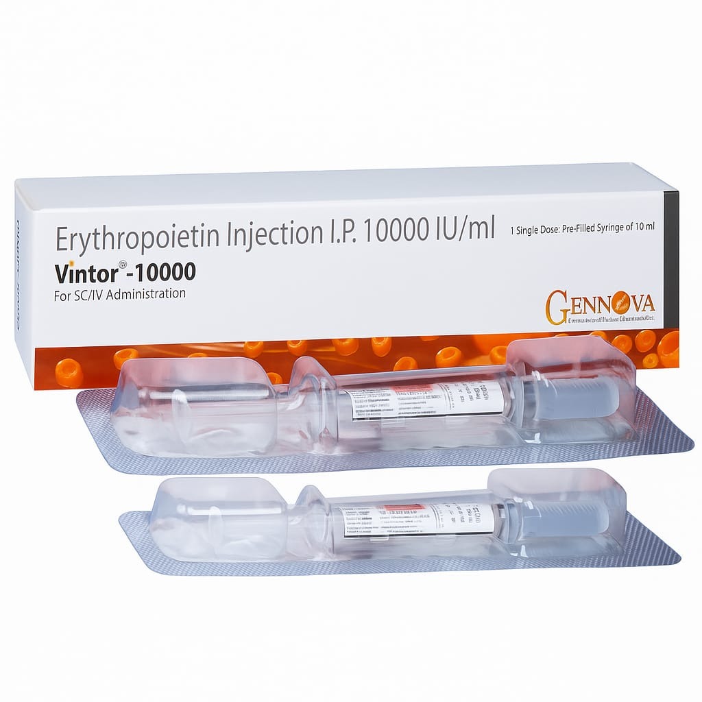 Vintor 10000IU Injection Vintor 10000IU Injection is a medicine that helps your bone marrow to produce more red blood cells. It is used to treat a type of anemia caused by kidney disease. It is also used to treat anemia caused by cancer chemotherapy and by taking medicines to treat HIV. @ERNESTPHARMACEUTICALPVTLTD For bulk quotations, availability, and orders, please contact us: πŸ“§ Email: exports@ernestpharmaceuticals.com 🌐 www.ernestpharmaceuticals.com| www.ernestimpex.com Amit Rai: WhatsApp link https://wa.me/message/M6GESWXSIOZMD1 πŸ“² WhatsApp: +91 94054 76170 Vintor 10000IU Injection is a medicine that helps your bone marrow to produce more red blood cells. It is used to treat a type of anemia caused by kidney disease. It is also used to treat anemia caused by cancer chemotherapy and by taking medicines to treat HIV. In Treatment of Anemia due to chronic kidney disease Vintor 10000IU Injection is a man-made protein that helps your bone marrow to produce more red blood cells. It is used to treat anemia which is caused by kidney disease in adults and children who are on dialysis. Anemia is a condition where your body does not have enough red blood cells to carry oxygen around your body. This medicine helps reduce weakness and tiredness that you may be experiencing due to anemia. The injection is usually given by a doctor after a dialysis treatment. In Treatment of Anemia due to cancer chemotherapy Anemia is a condition where your body does not have enough red blood cells to carry oxygen around your body. Vintor 10000IU Injection is a man-made protein that works by stimulating the bone marrow (soft tissue inside the bones) to produce more red blood cells. The natural human form of this protein may be reduced when you are having chemotherapy to treat some types of cancer. An injection of the medicine can reduce the need to have a blood transfusion. You may also be given iron supplements to make the treatment more effective.